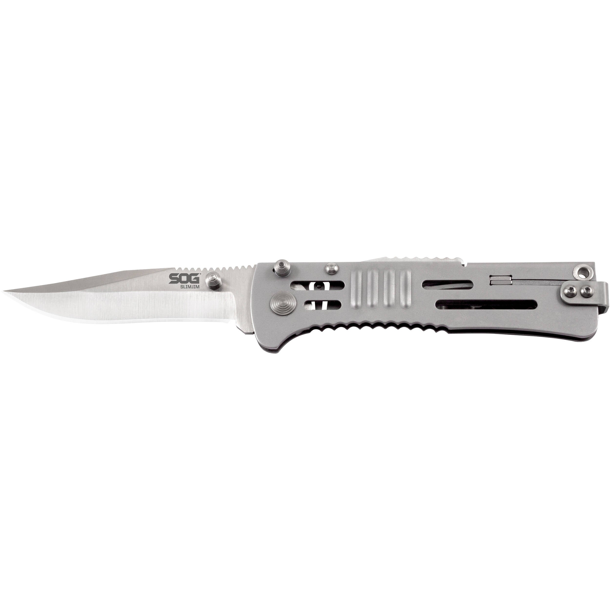 Milled from a single piece of steel, the SlimJim is SOG's thinnest blade to offer assisted open technology. The perfectly-balanced high-tension springs pop the blade open when you initiate unfolding with your thumb. An included clip allows you to carry the knife low in your pocket. The result is a thin, light, and stealthy knife that's ready to leap into action. Choose the satin finish, or the hardcased black TiNi for extra discretion. Also available in a larger version, the SlimJim XL, and a tanto blade version.