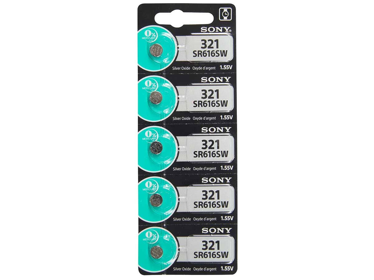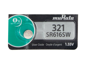 The Murata SR616SW silver oxide battery is suited for powering low-drain electronic devices, such as a watch or a clock. This non-rechargeable coin cell offers a 16mAh capacity for long-lasting power on which you can rely. The Murata SR616SW, also known as size 321, measures just 6.8 mm in diameter and 1.65 mm in length; though small in size, this micro battery is sure to keep your watch powered and working. This silver oxide cell is sold individually in tear strip packaging. When purchasing in higher quantities, the size 321 battery will be packaged in tear strips of five.