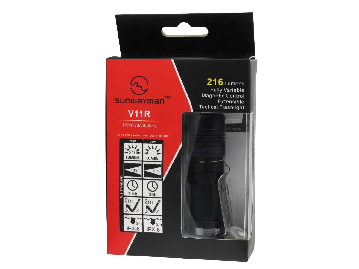 In life there are always compromises you have to make - but your flashlight choice should not be one of them! The Sunwayman V11R-XML2 light combines a high Lumen output, a bright CREE XM-L2 (U2) LED, and an extremely reasonable price. That's right, you can get a great quality light at an even greater price! It measures in at an impressively small 3.3" in length and 0.9" in diameter. You might think that such a small body cannot put out much light - but you would be mistaken! It has a maximum output of 570 Lumens!!