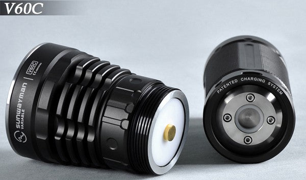 SUNWAYMAN V60C Fully Variable Magnetic Control Flashlight This flashlight is the first rechargeable model from Sunwayman, but still holds a valued place among rechargeable lights. The new soft contact charging system can recharge 3 x 18650 batteries or 6 x 16340 batteries time and time again so you never run out of power. This simple and beefy light hides more than meets the eye, offering incredible run times on a super-low standby current, featuring a wide range of output levels, and with the easy to use charging dock (sold separately), this light is a great choice for all around use day-in and day-out.
