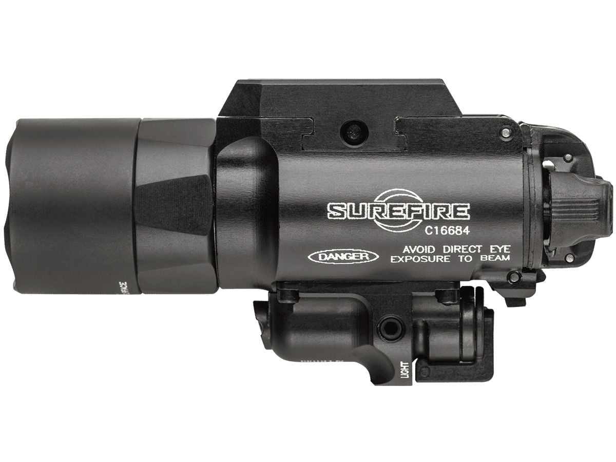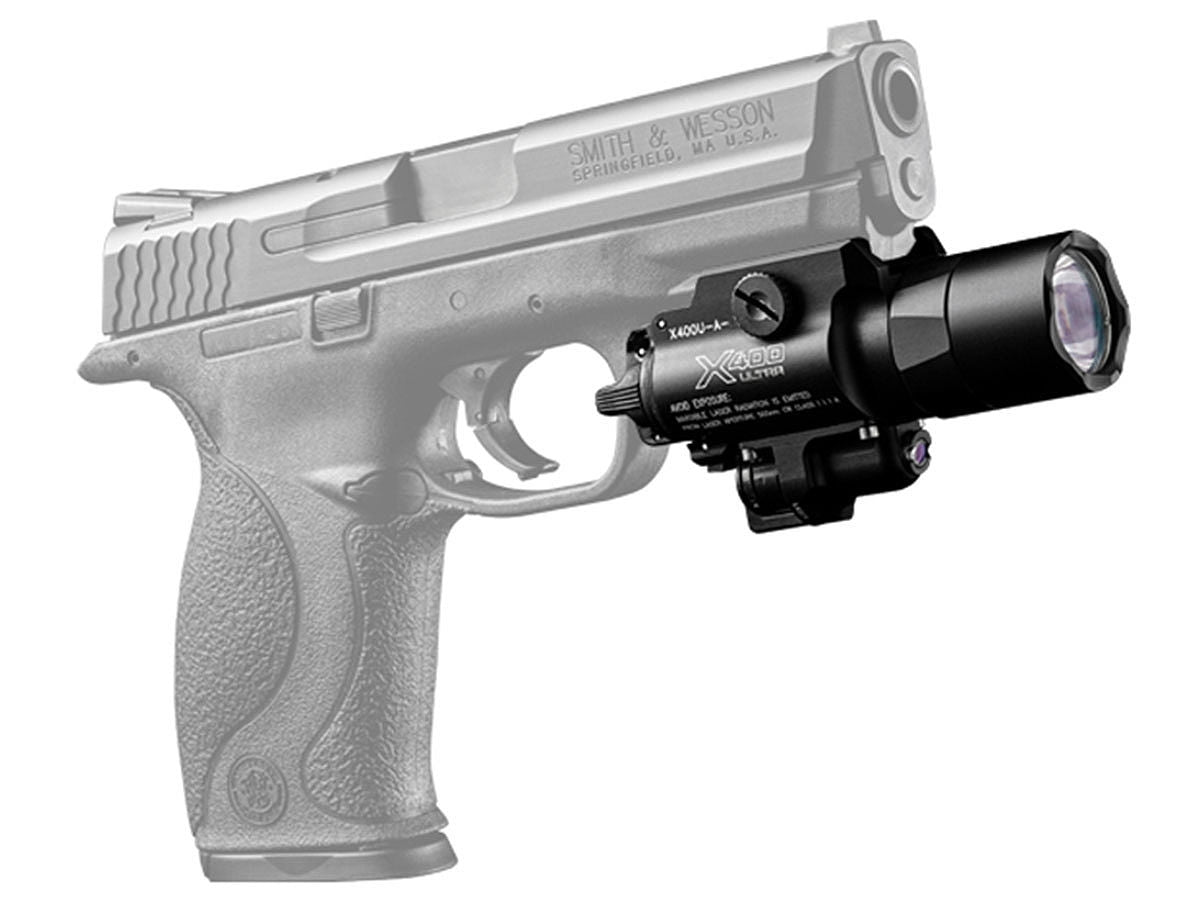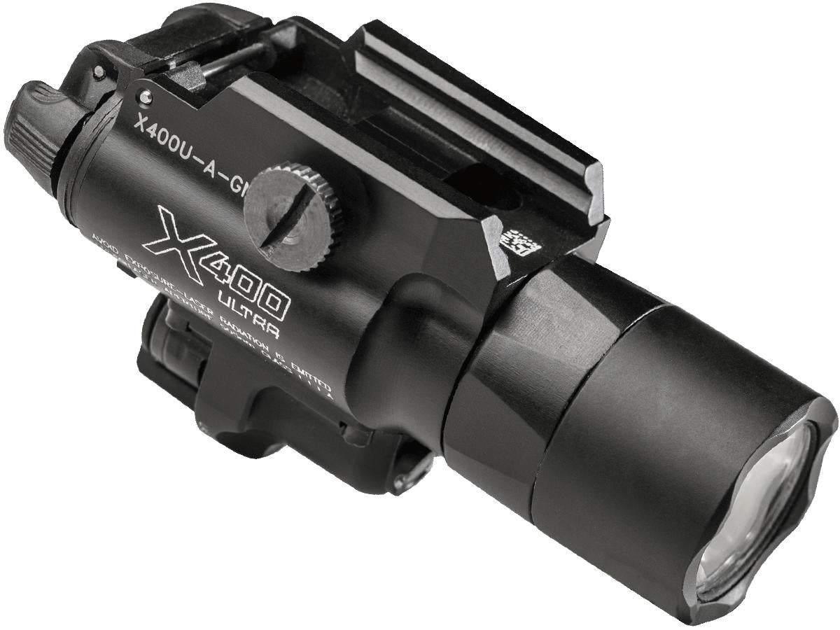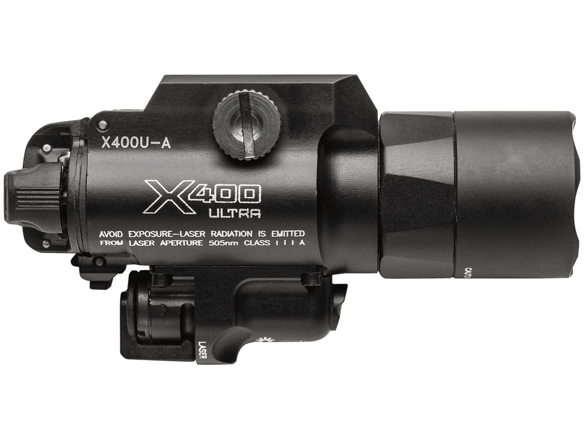 SureFire X400U-A-GN Ultra LED Weapon Light w/ Green Laser Sight - 500 Lumens - Runs on 2x CR123A Batteries (X400U-A-GN)The SureFire X400 Ultra WeaponLight integrates a powerful, high intensity white light and a high visibility laser in one compact rail mountable package. A high performance LED generates 500 lumens of brilliant white light that is focused by a Total Internal Reflection (TIR) lens to produce a beam with a bright central area, providing greatly extended reach and significant surround light. The high strength aerospace aluminum body is Mil-Spec hard anodized for superior toughness and corrosion resistance and is O-ring and gasket sealed to keep out dust and moisture.The X400 Ultra's laser is located below the primary light, and its aiming adjustment mechanism uses Nylok screws that won't back out from the effects of recoil, which means it rarely needs to be re-zeroed. Featuring a high visibility 5-milliwatt / 505 nm green laser, optimized for human eye response, and the first ever green laser diode model that is durable and reliable at a wide temperature range. This versatile weapon light can be attached to a pistol or a long gun since its Rail-Lock system permits rapid attachment/detachment to either universal or Picatinny rails. Its integral ambidextrous push/toggle switch provides one finger operation for either momentary or constant-on operation. This is an extremely effective combination for close to longer range engagements in law enforcement, military, and self-defense applications.FITS: Handguns and long guns with picatinny or universal rails.Features and Specifications: