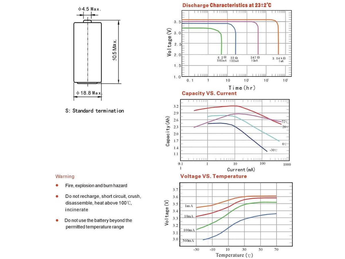 The Titus ER18505M uses its Lithium Thionyl Chloride chemistry to output an optimal voltage and capacity that best suits select devices. The 3,200 mAh capacity and 3.6 volts of power combine to offer long-lasting, stable output. The ER18505M is ideal for automotive electronics, security systems, and utility metering.