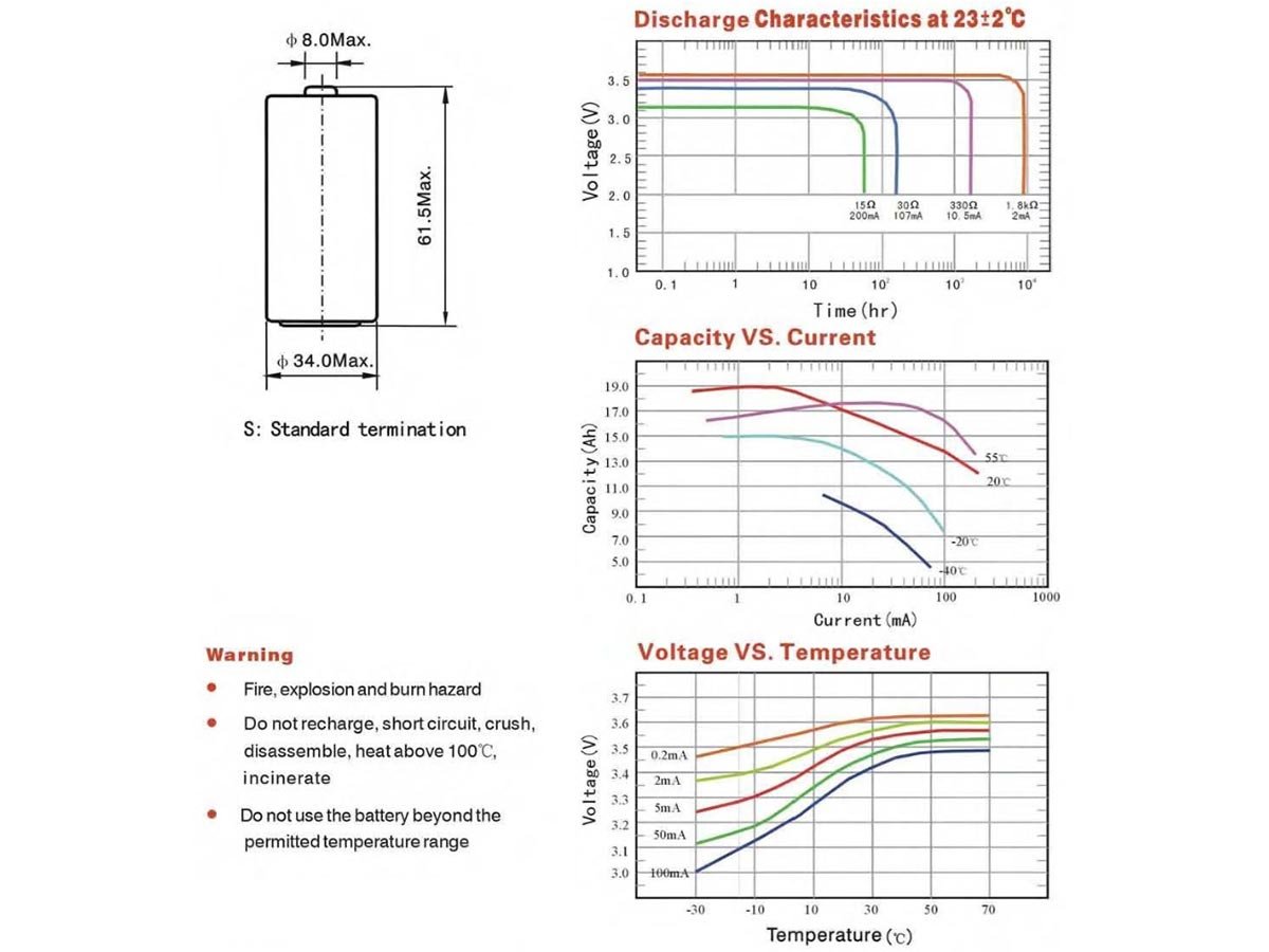 The Titus ER34615 is a D-cell battery with a Lithium Thionyl Chloride chemistry that gives the battery a high energy density. This bobbin wound design allows the cell to provide higher capacity and lower self-discharge, ensuring reliable performance and long service life in low drain devices. It has a 19,000mAh capacity and 3.6 Volts which help to provide longer runtimes. Have ideal power flow for medical technology or industrial applications!