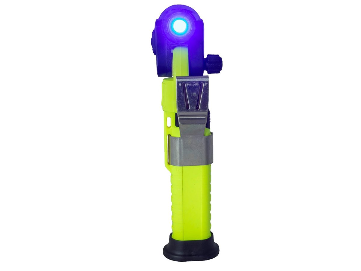 Illuminate your workspace with Underwater Kinetics' 4AA Lighthouse Dual Blue work light. This personal lighting device features a front-facing white spotlight that shines with 130 lumens and reaches over 140 feet, perfect for illuminating tasks, areas, and tunnels. The rear-facing blue light is perfectly suited for applications like construction and public transit repair. Specifically, railway workers can use this light to signal their position with the utmost clarity to encourage safety on the job.