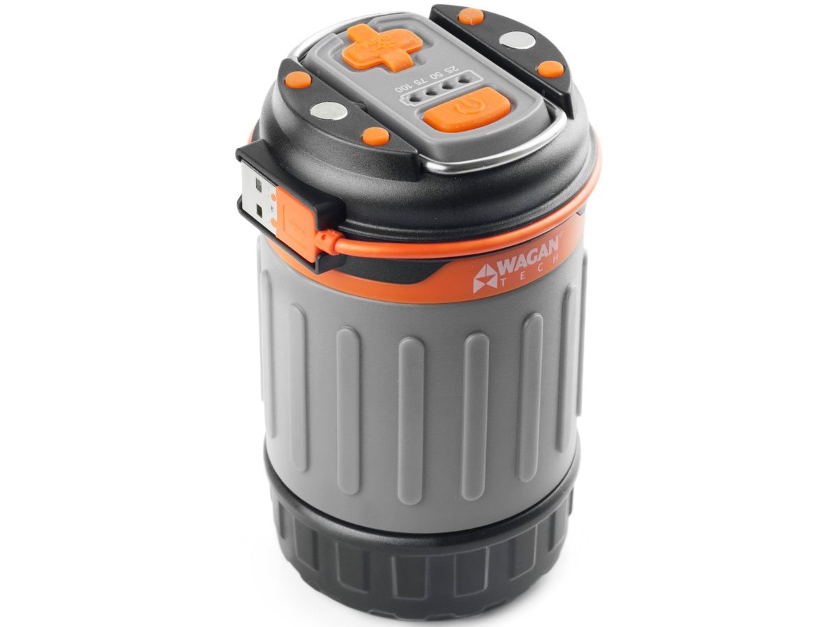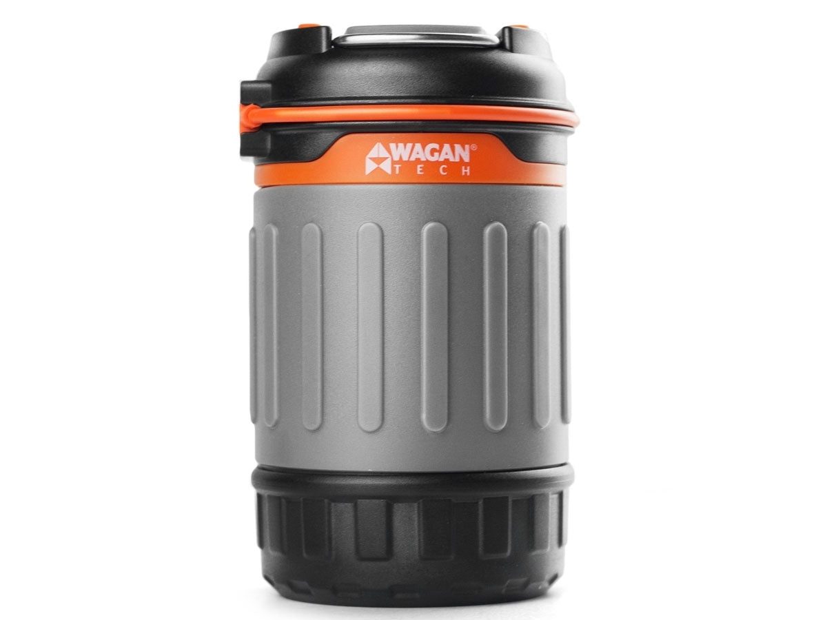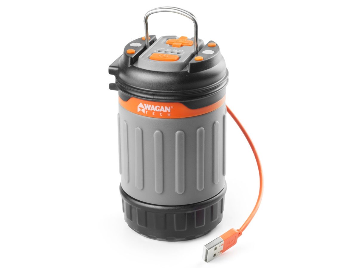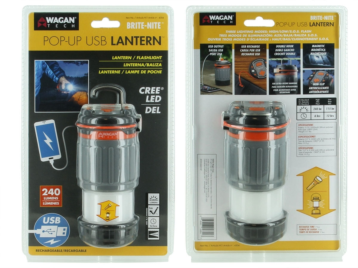 The Wagan Brite-Nite™ Pop-Up USB Lantern is one of the most versatile and useful tools for your next outdoor adventure. Powered by a powerful Lithium-Ion battery pack, this potent illuminator uses its sophisticated CREE LED to produce an impressive 240 Lumens of light that can throw a remarkable 885 feet! The light also features a dimmer 115 Lumen setting, as well as a special S.O.S. Mode that produces an efficient Morse code flash for up to 24 hours in emergency situations. Pull on the light's black lens cap and it is transformed from a flashlight into a convenient lantern, perfect for lighting your campsite. The Brite-Nite™ comes with a duo of metal folding hooks in its base for hanging, as well as a pair of powerful magnets for mounting on metal surfaces, allowing for a number of hands-free area lighting options.