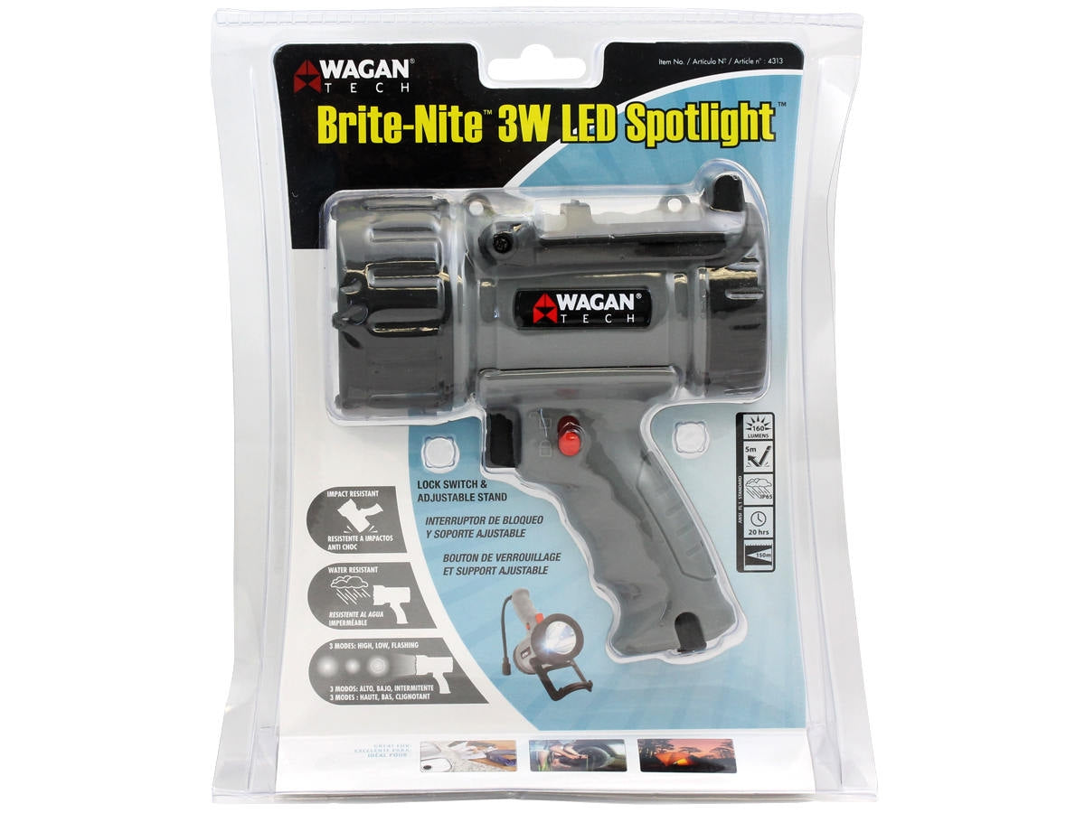 The Wagan Brite Nite 3W LED Spotlight will light up any area with its power and brightness. It is a heavy duty, thermoplastic/rubber constructed and weatherproof flashlight that runs for 10 hours on high mode and 20 hours on low mode using 3 C batteries. It has 3 different lighting modes including a high, low and flashing mode. This spotlight is capable of producing a maximum of 160 lumens on high mode and has a 150 meter maximum beam distance. Its comfortable pistol grip makes it a joy to carry around and features a switch lock that keeps your light On or Off. A built-in adjustable stand allows you to keep your spotlight stationary and aim it in any direction. You can count on this light for reliable and durable power since it is water resistant to IP65 rating and impact resistant up to 3.3 feet. The Wagan Brite Nite 3W LED Spotlight is an affordable lighting option that provides you with a quality experience.