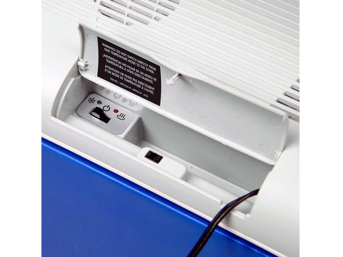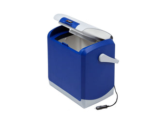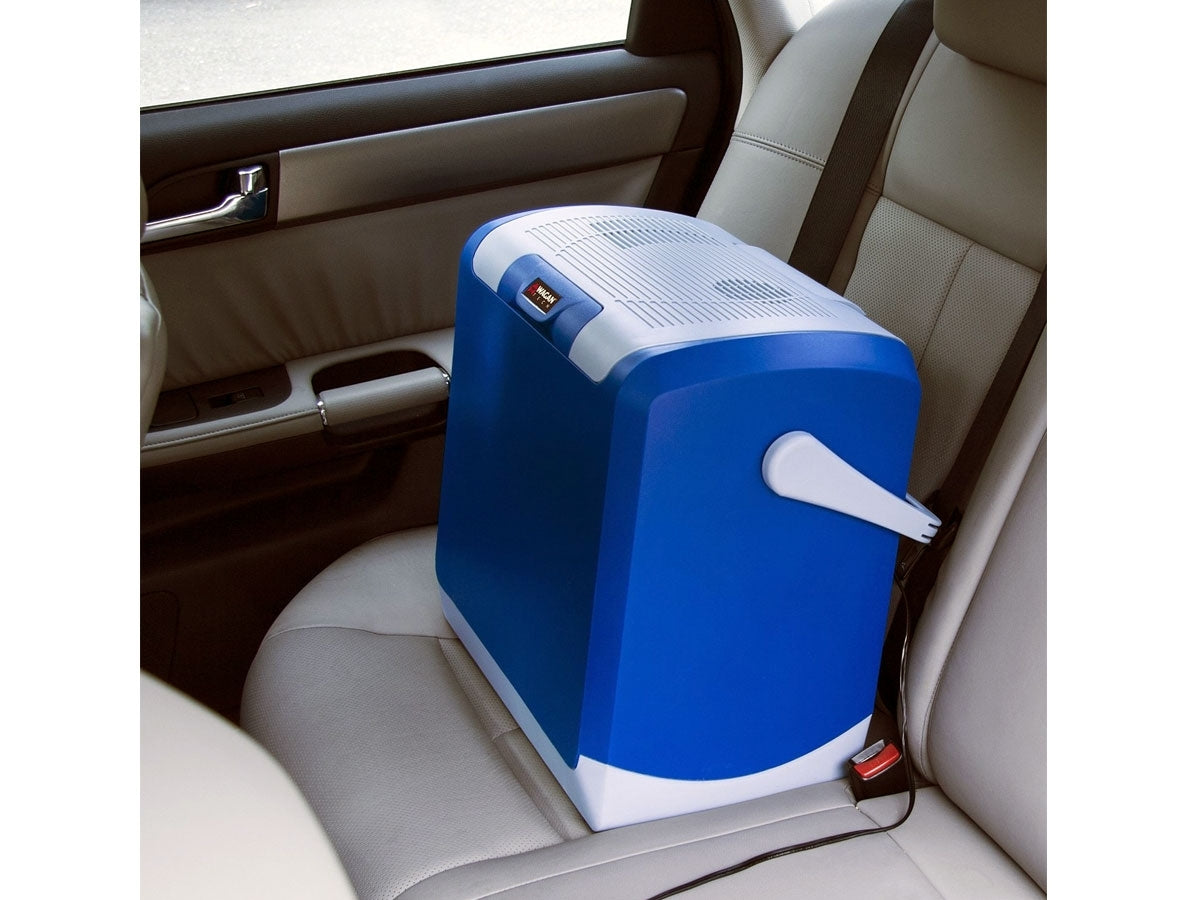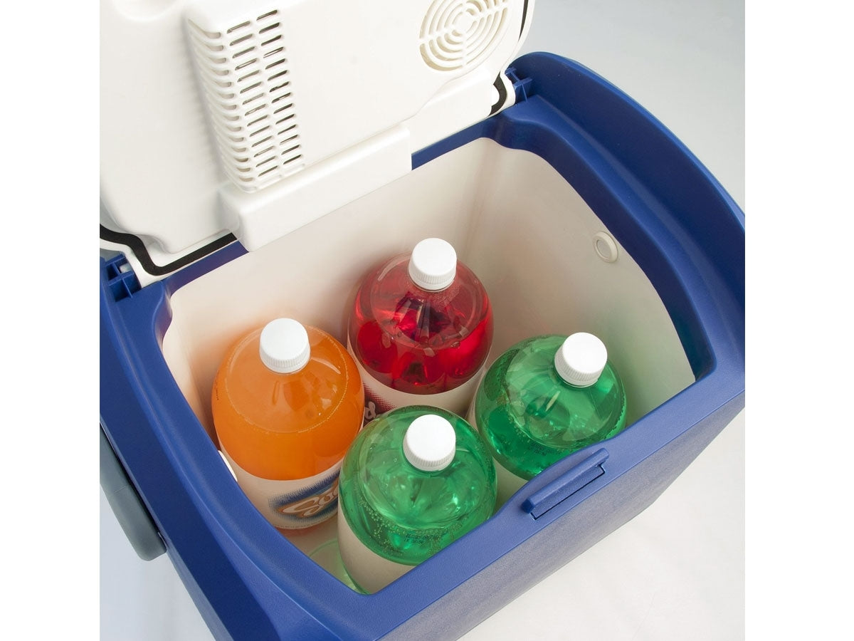 Keep your food hot or cold anywhere you go with this portable fridge/ warmer. Designed for easy access while commuting, the Wagan 24 Liter Personal Fridge/Warmer conveniently plugs into your vehicle's cigarette lighter socket and sits beside you as an armrest. Using space age technology and superior foam insulation, it cools down as low as 32°F and at a flip of the switch it can heat up to 140°F. It's great for use while commuting, traveling, boating, camping, tailgating, and picnicking, and the optional AC adapter can even be used for home, office, and dorm use.Features:- Large capacity - fits four 2 Liter bottles or up to 27 cans - or ample room inside for food and snacks