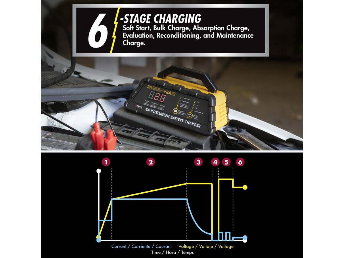 - Smart six stage charging process to start, evaluate and even maintain battery.