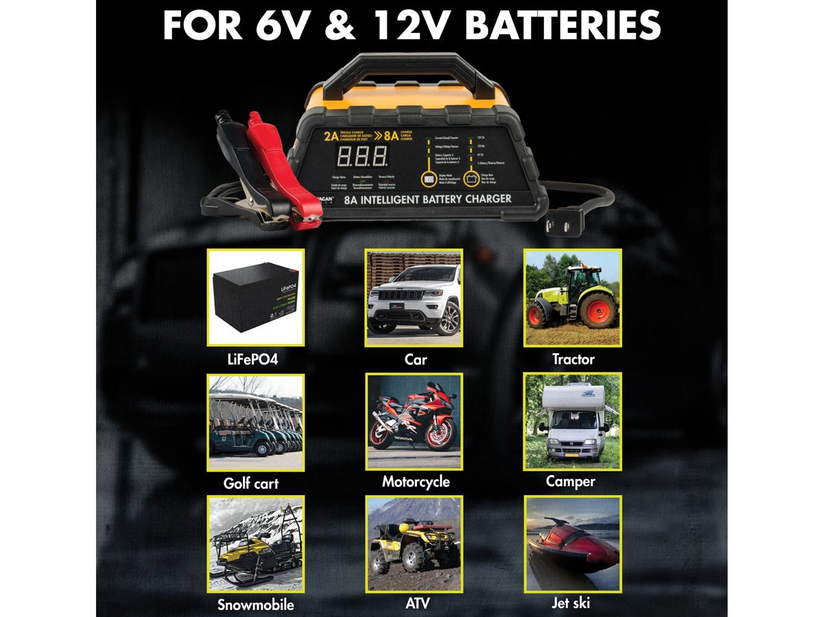 This charger supports a wide variety of applications such as ATVs, golf carts, motorcycles, boats, trailers, lawnmowers, auxiliary batteries, solar batteries and many more. As for types of batteries, the 8A Intelligent Charger can maintain and charge Lithium iron-phosphate (LiFePo4), LPF, SLA, AGM, Maintenance Free, Flooded, Wet Cell, VRLA, Gel, Lead-Acid, Vented, and Deep Cycle batteries.