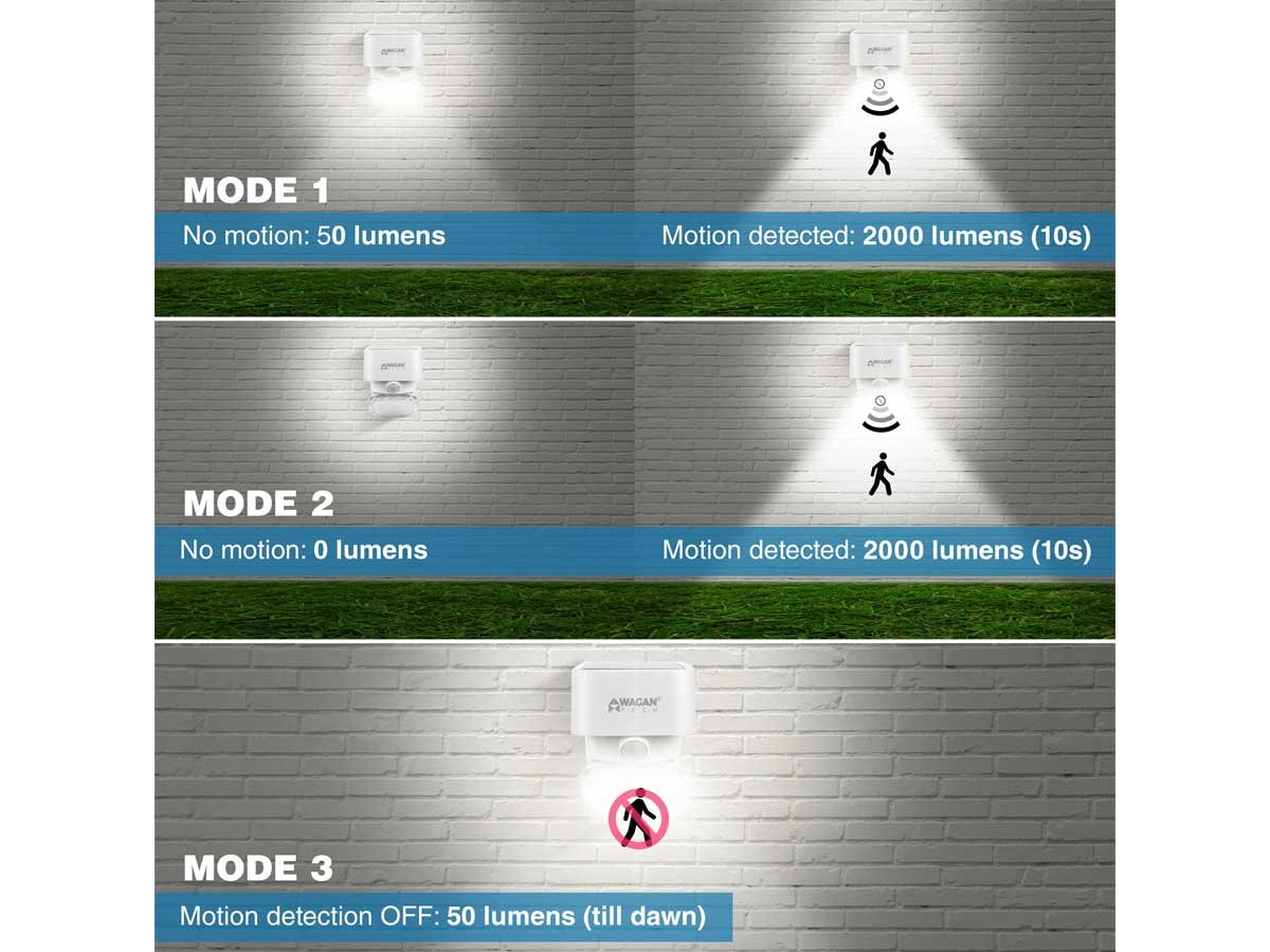 A great way to keep convenient outdoor lighting around, the Wagan Solar Wall Light is a wall mountable LED light powered by the sun. Compact in size, it is still capable of emitting up to 2000 lumens of light which is perfect for sidewalks, driveways, decks or wherever you need that light. This solar light has 3 easy-to-use modes that allow you to adjust the standby 50 lumen light level and full powered level that activates upon motion detection. Need light in just the right spot? This light is angle adjustable - position just right for the perfect spread of light.