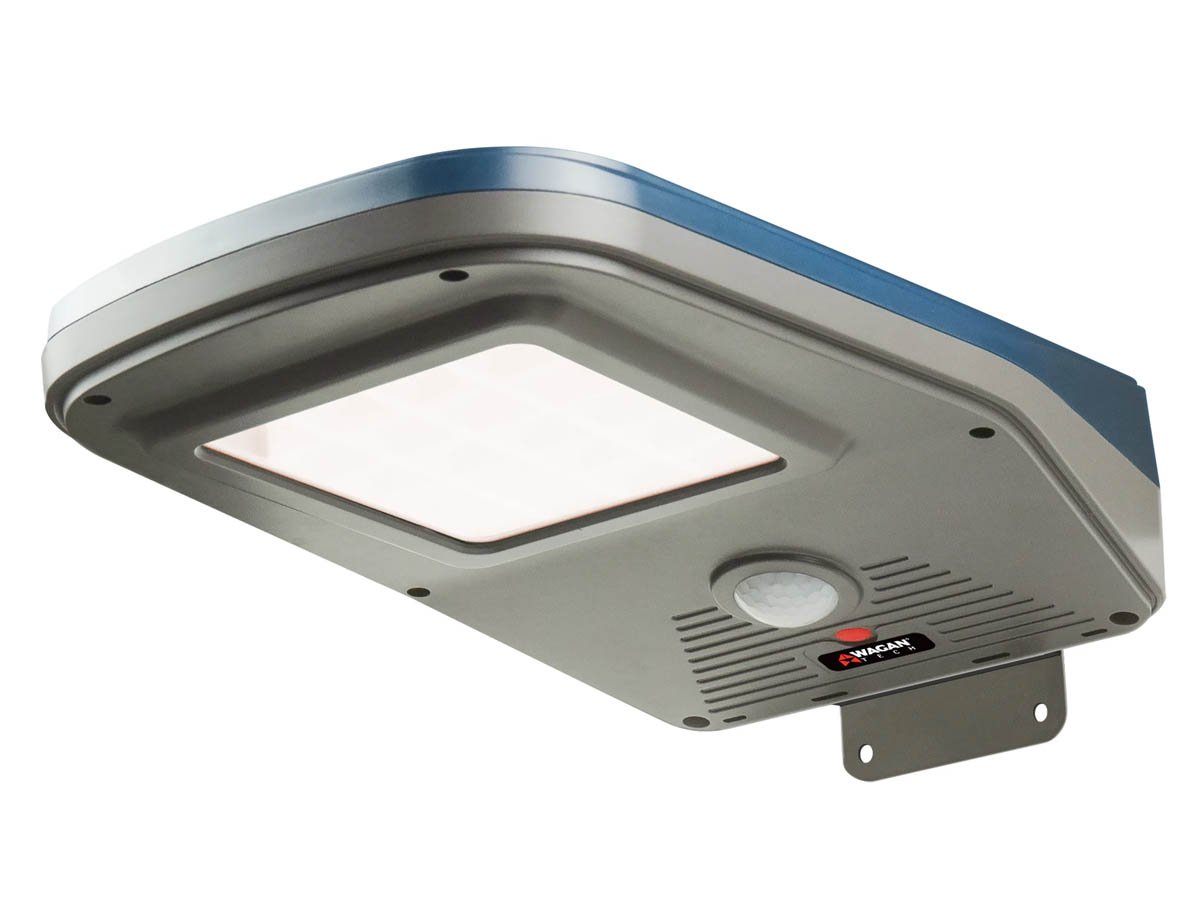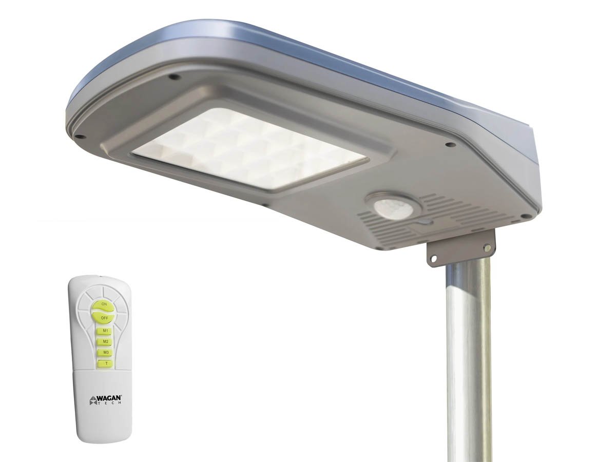 The Wagan 8591 Solar Flood Light is a solar-powered floodlight that can be mounted outdoors on a wall or pole. Using the included remote, you can set your light to a variety of motion-detection or timer modes. A multicolor LED indicator on the floodlight itself will identify what mode your light is set to.