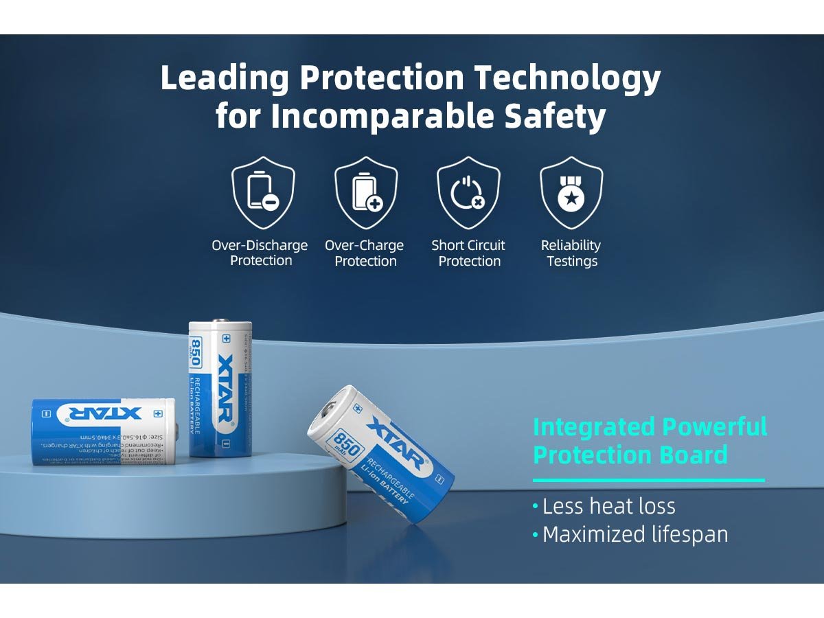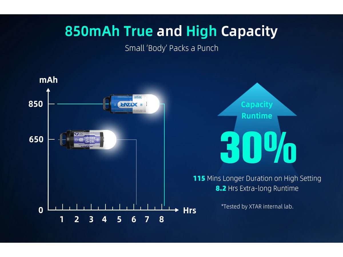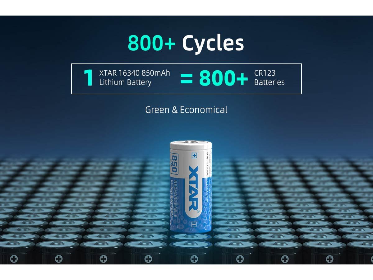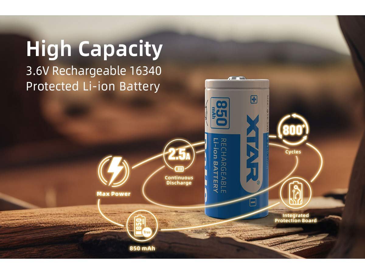 If you're looking for a reliable 16340 battery for your flashlight, look no further than the XTAR 850mAh 16340 Battery! Thanks to its 850mAh capacity, you have high power retention that delivers longer runtimes in devices, great for extended use. With lithium-ion chemistry, this battery is fully rechargeable and has a whopping 800+ charge cycles, a reliable long-term choice. It has a voltage of 3.6V for reliable power flow great for high-drain electronics or your favorite compatible flashlight. This Li-ion 16340 battery has over-discharge, over-charge, and short circuit protection to safeguard your battery and yourself.