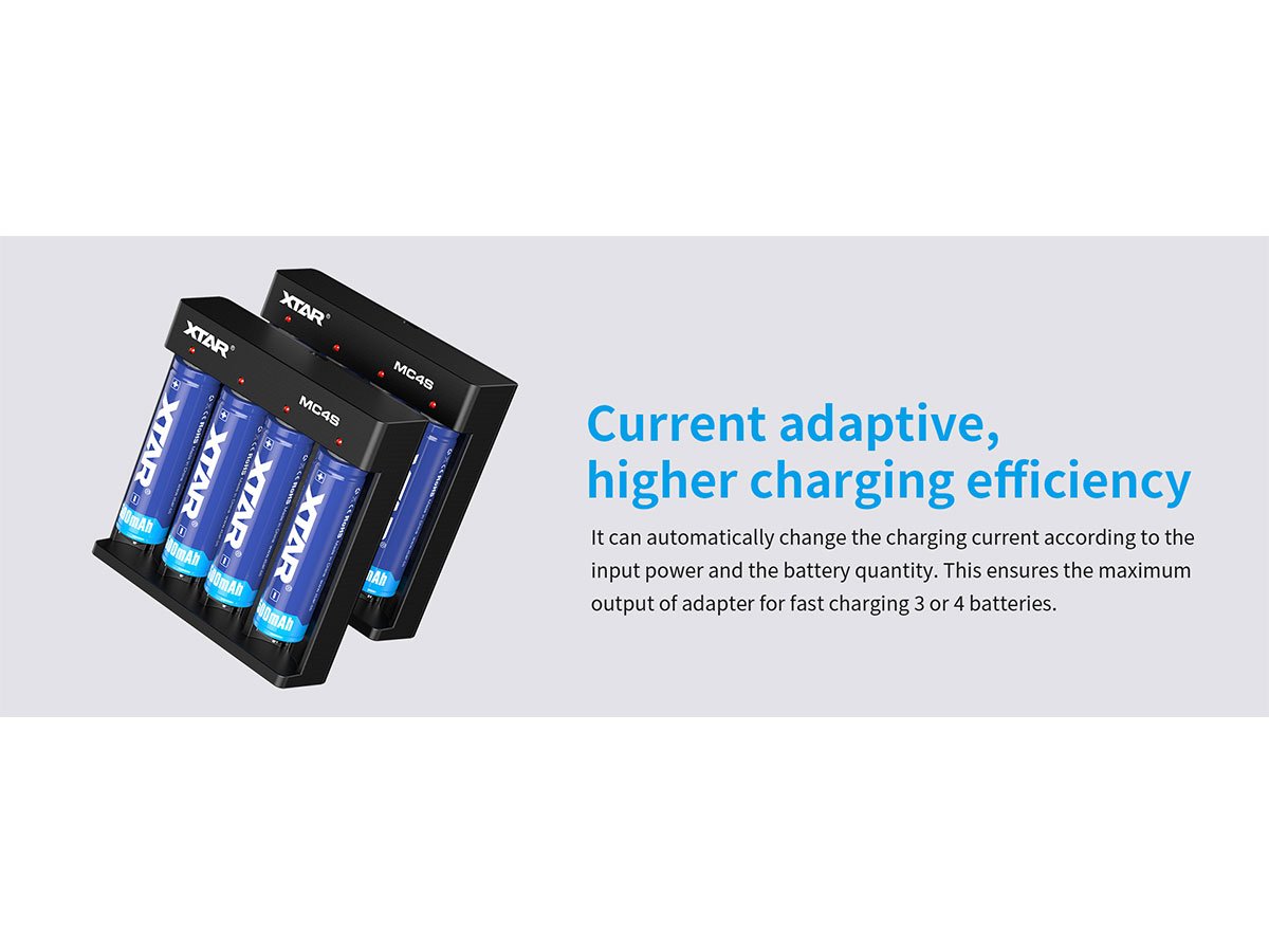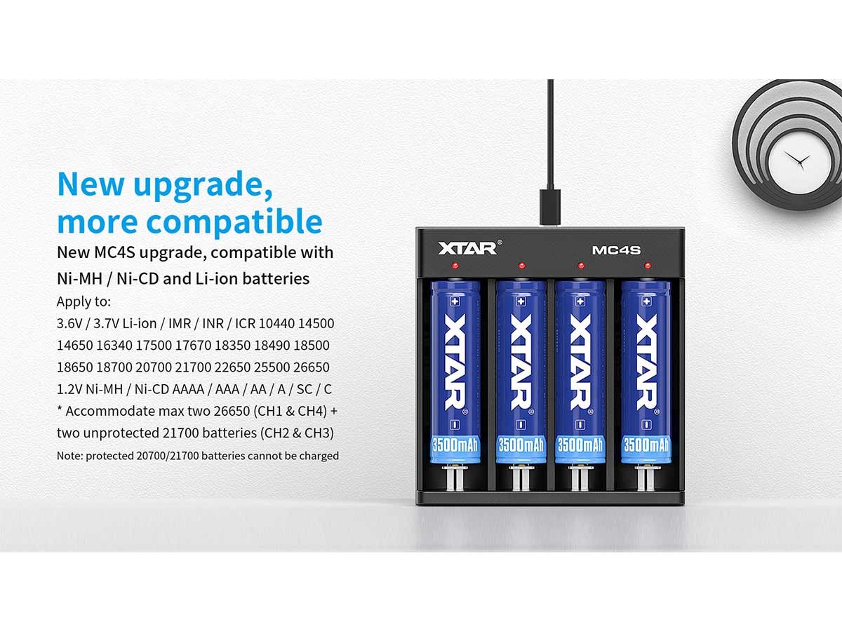 Have everything you need to charge batteries with the XTAR MC4S. Supporting both Li-ion and Ni-MH rechargeable batteries, have an array of compatibility when using this charger. With every charging slot acting independently the MC4S supports mixed charging, even powering high-capacity batteries like 26650s and 21700s. Not only that, it matches charging to specific batteries according to quantity and input power. When utilizing USB-C input, plugging in and charging is streamlined and simple.