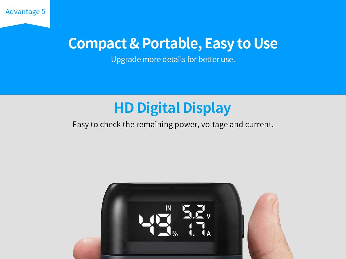 The easy-to-read digital display gives you all the details you need to know about each battery, including charge level, voltage, and current. If you want to use your battery power to charge external devices, like a phone or pair of earbuds, the dual USB output ports have you covered. Simply connect the PB2SL to the desired device and power will flow safely and quickly, utilizing QC3.0 protocol that fills an iPhone 13/14 in 90 minutes. Go far with your smartphone or flashlight and have a power bank that has your back, perfect for outdoor trips or traveling!