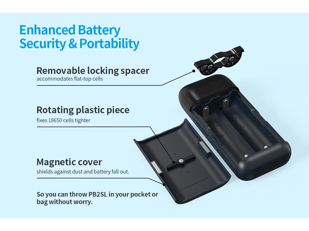 When you need to charge your batteries and want to use them to power external devices like your phone, the XTAR PB2SL is for you! The PB2SL is a 2-bay battery charger that features broad compatibility with 18650, 18700, 20700, and 21700 batteries. It even includes a spacer which can be used to insert flat-top cells as well as button top.