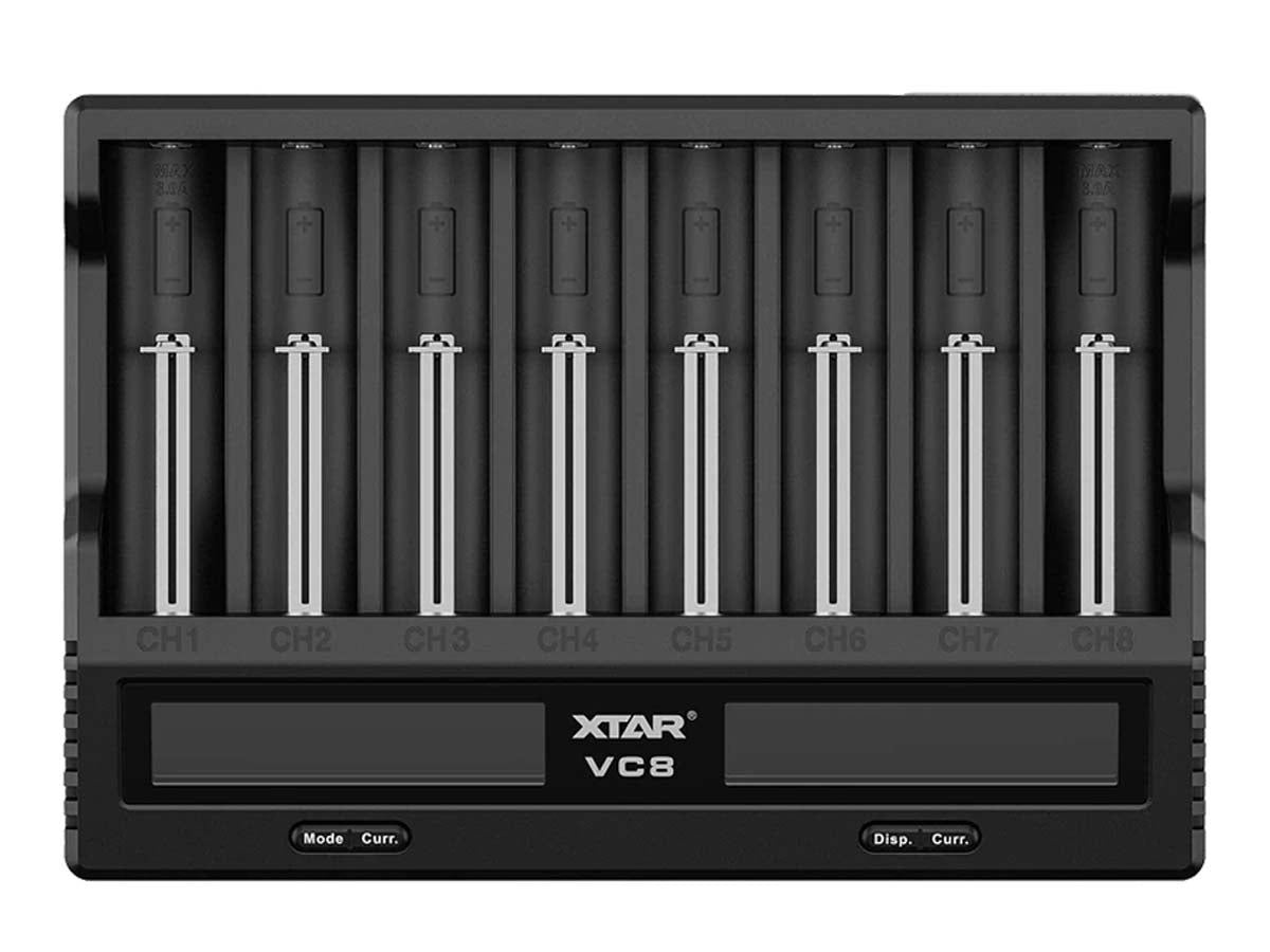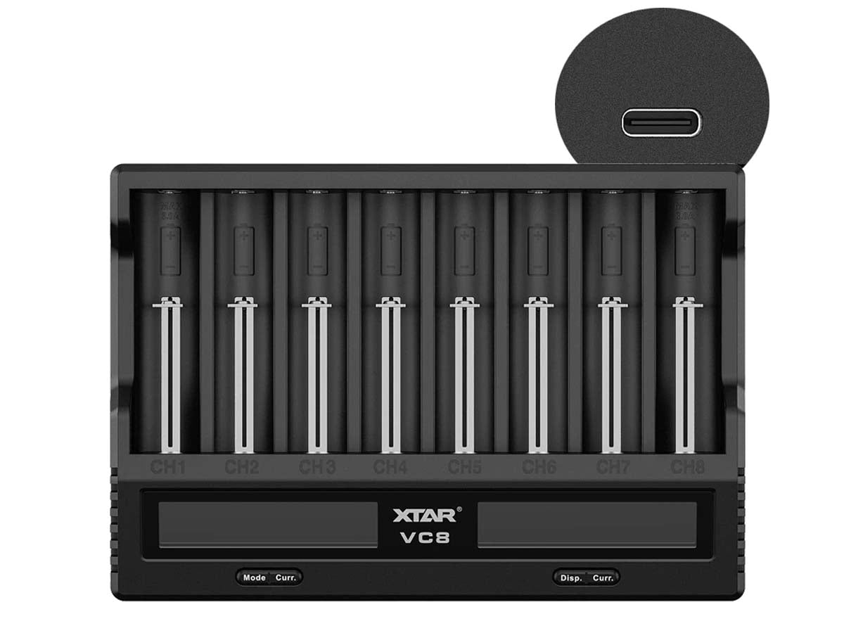 The XTAR VC8 is an 8-channel charger that supports Li-ion, NiMH, and NiCd chemistries. This charger supports QC3.0 fast charging and has a max 3A current for each slot. This can be changed manually to either 3A, 2A, 1A, 0.5A, or 0.25A allowing the user to adjust the currents to the demands of their batteries. The XTAR VC8 utilizes a USB-C input current for faster charging of all the batteries. Another great bonus to this battery charger is that integrated LCD screen that provides real-time information including voltage, capacity, internal resistance, and battery type. The VC8 has two user modes: grade and storage. Storage mode makes it easier to charge or discharge batteries to its rated voltage to maximize the lifespan of your batteries especially when they're in transport. Grade mode tests the true capacity of your batteries so you'll know what they're truly capable of.
