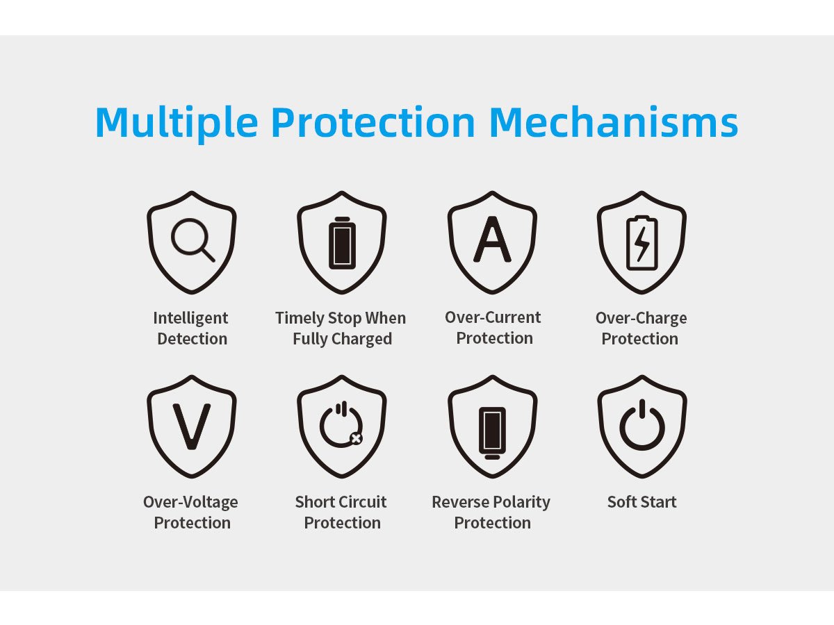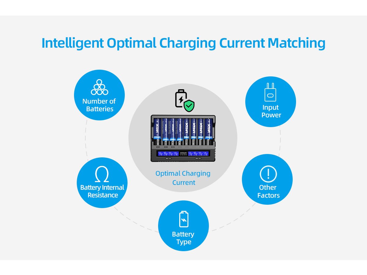 - » Intelligent charging balances factors like number of batteries, internal resistance, battery type, and input power to determine the optimal charge current