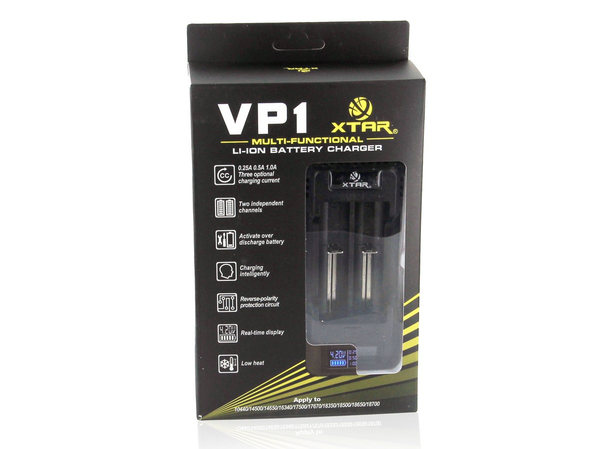 The VP1 can charge up to two batteries simultaneously and charges ten different types of lithium-ion batteries including the mostcommon 14500 and 18650s. The best part, you won't have to load different spacers to charge different types of batteries, the spring loaded contact plates will adjust to the right size automatically. Make sure to check the features and specifications section for more details.You can choose between three unique charging modes - 0.25A, 0.5A, 1.0A. Reverse polarity protection circuit board comes standard so if you accidentally put your batteries in backwards, there will be no harm done. The LCD display is one of the key features to the VP1. With it you can clearly and easily read battery charging status, voltage levels and charging mode like never before. The VP1 is particularly good at restoring life to previously drained batteries. The LCD display will flash an empty battery symbol to indicate that it is switching to Soft Start function to trickle charge the dead battery. The VP1 alsocomes with guaranteed over charge protection which will automatically stop current into the battery as soon as it's reached capacity. Combine all of this with top notch heat dissipation and fireproof ABS plastic casing and what you're left with is one of the safest, easy to use, and reliable battery charger on the market. If you haven't tried a XTAR charger, you gotta give it a shot. Features and Specifications- Choose between three unique charging modes: 0.25A, 0.5A, 1.0A