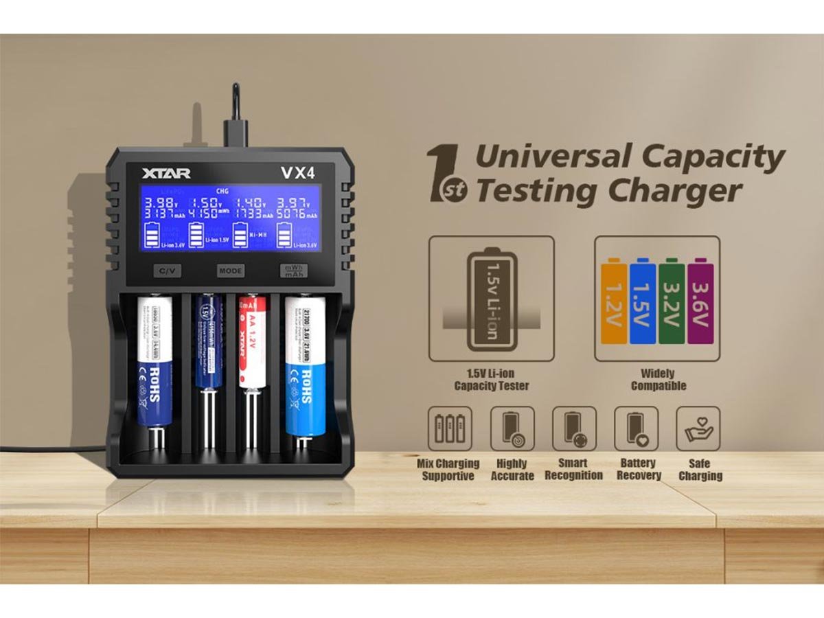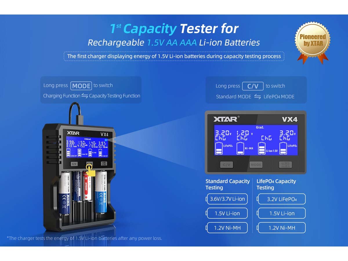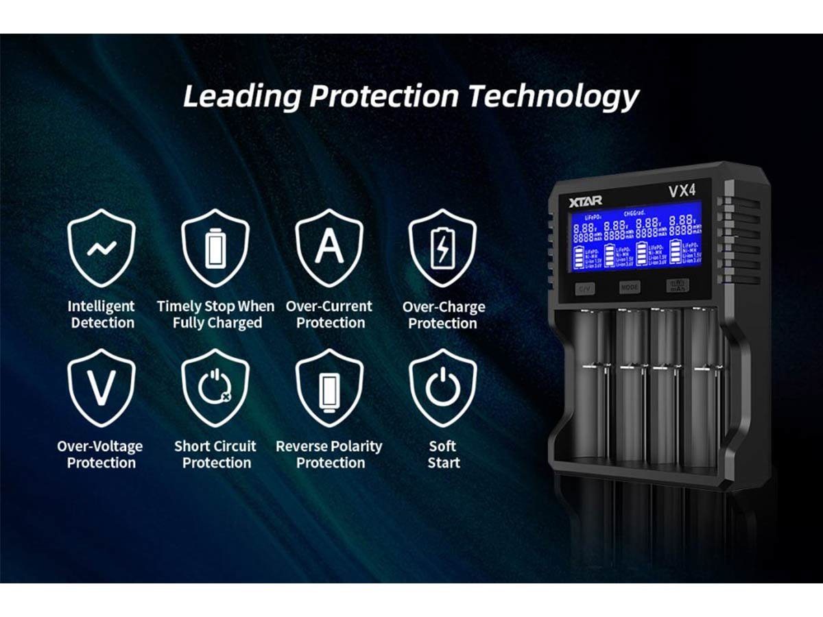 This smart charger allows you to manually set the current level to access the charge speed you need. It is built with Micro-current Activation Technology to recover dead batteries at a higher rate, safely! The VX4 has a trickle charging, constant current charging, and constant voltage charging (TC-CC-CV) process. This charging process gently wakes up the batteries, optimally charges, and completes with a safe full charge. This gives you safe, optimal charging of your batteries so you can charge up efficiently for daily use! It has a full array of protection technology, from over-current, over-charge, and over-voltage protection and more. Also, the VX4 is the first charger that displays the energy of 1.5V Li-ion batteries in the capacity testing process, innovating in battery testing capability.