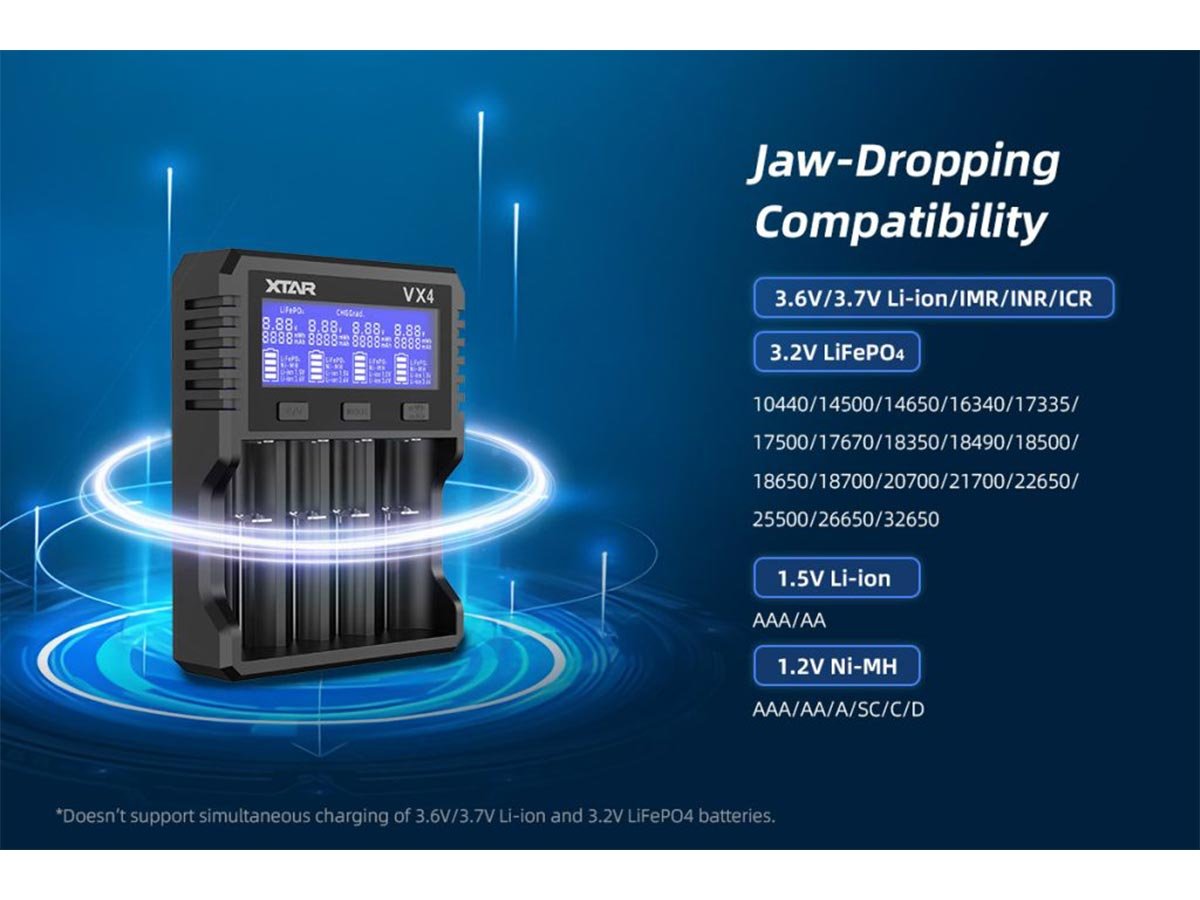 If you have rechargeable batteries left and right, the Xtar VX4 is the charger for you. Numerous chemistry, voltage, and battery type support is on the table with this smart charger. It charges 3.6V Lithium-ion 18650 and 21700 cells to 1.5V Li-ion AAs and 1.2V Ni-MH C and D cells. Specific battery sizes such as 10440, 17500, 26650, and 32650 batteries are also fully supported. No matter what combination of batteries you place, the VX4 has accurate battery recognition capability that offers reliable mixed charging! You can use standard or LifePO4 charging modes on each charging bay to prioritize battery types accordingly with ease.